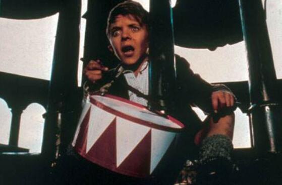 小奥斯卡与他的小铁皮鼓总是形影不离,这个唯一的让他还对整个世界眷恋的鼓在某种意义上说已经和他合二为一,这不仅仅指表象的形影不离,鼓更多的扮演一种生命承载者的身份,它与他之间用一种难以捉摸的方式沟通。很多时候,鼓声便是小奥斯卡另外一种形式的尖叫,另外一种形式的呐喊,它的声响和节奏往往凝聚了奥斯卡的情绪,快乐、天真、忧伤、恐惧。奥斯卡的第一节课会是让老师永生难忘的,他的鼓点声和尖叫声让老师脆弱的神经被深深刺痛,这种无拘束的情绪发泄也会让这种刺痛感蔓延到观众身上。在小说中众多被奥斯卡尖叫声“袭击”的对象中有两个引起了我们的注意,一个就是象征“同化符号”的老师(准确来讲是老师的眼镜片),另外一个是象征“禁锢符号”医生的标本瓶。被震碎的标本碎片和横流的福尔马林液体包裹的幼儿雏形分明是小奥斯卡的一种潜意识的反抗,这种对制度禁锢的反抗来的隐讳却异常的直接,虽然没有[肖生克的救赎]结尾的戏剧化的反抗来的酣畅淋漓,没有[飞跃疯人院]结尾自由主义回归来的耐人寻味,但尖锐的表达、形象的借喻以及深刻的讽刺效果让人记忆犹新。